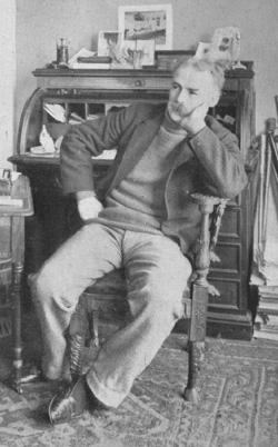 I found him sitting in his plethoric, disorderly writing-room : there are two kinds of bachelors, the raspingly tidy sort, and the hopelessly ramshackle; Wilkie was of the latter. Though the England of his prime had been a cricketing, athletic, outdoor England, Wilkie had ever slumped at his desk and breathed only indoor air. He was soft, plump, and pale, suffered from various ailments, his liver was wrong, his heart weak, his lungs faint, his stomach incompetent, he ate too much and the wrong things. He had a big head, a dingy complexion, was somewhat bald, and his full beard was of a light brown colour. His air was of mild discomfort and fractiousness; he had a queer way of holding his hand, which was small, plump, and unclean, hanging up by the wrist, like a rabbit on its hind legs. He had strong opinions and prejudices, but his nature was obviously kind and lovable, and a humorous vein would occasionally be manifest. One felt that he was unfortunate and needed succour. To his visitor he was very gracious, in a distressful way.
