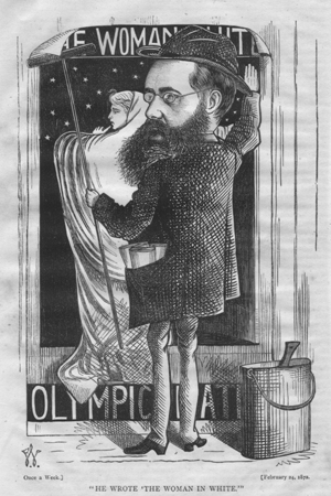 Once A Week was owned and edited by James Rice (1844-1882) from 1868 to 1873. During that time he published a series of contemporary ‘Caricature Portraits of Eminent Public Men’ drawn by Frederick Waddy. This drawing of Collins shows him pasting up the poster for The Woman in White which was currently showing at the Olympic theatre. Each cartoon was accompanied by short biographical notes on the subject. Collins appeared in the issue of 24 February 1872. The author of the piece is unknown but could have been Rice himself. |