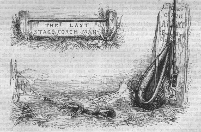 "I did my utmost to hoppose ’em," said the Stage Coachman, in softened accents. "I wos the last that guv’ in, I kep’ a losing day after day, and yet I worked on; I wos determined to do my dooty, and I drove a coach the last day with an old hooman and a carpet bag inside and three little boys and seven whopping empty portmanteaus outside. I wos determined my last kick to have some passengers to show to the rail, so I took my wife and children ’cos nobody else would’nt go, and then we guv’ in. Hows’ever the last time as I wos on the road I did’nt go and show ’em an empty coach—we wasn’t full, but we wasn’t empty; we wos game to the last!"