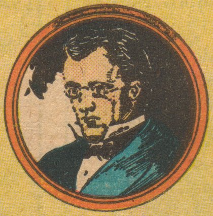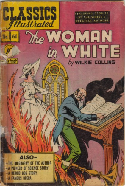 Cover of the 1949 Classics Illustrated edition of The Woman in White. The comic was reissued later with an alternative cover but the same portrait of Wilkie Collins. The cover and illustrations throughout were by Alex A Blum. But the portrait may have been by someone else. |